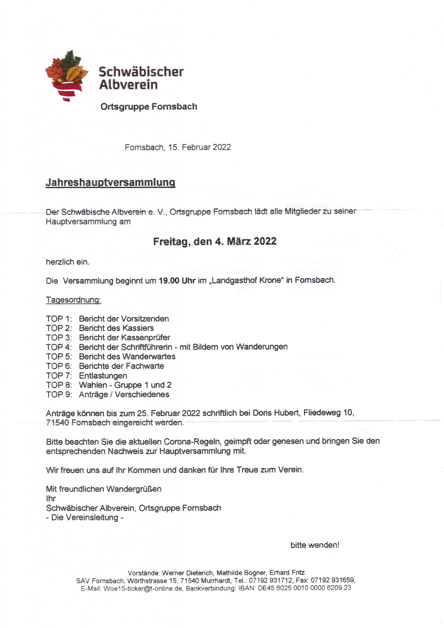 Die Hauptversammlung des SAV Fornsbach findet im Gasthaus Krone in Fornsbach statt.